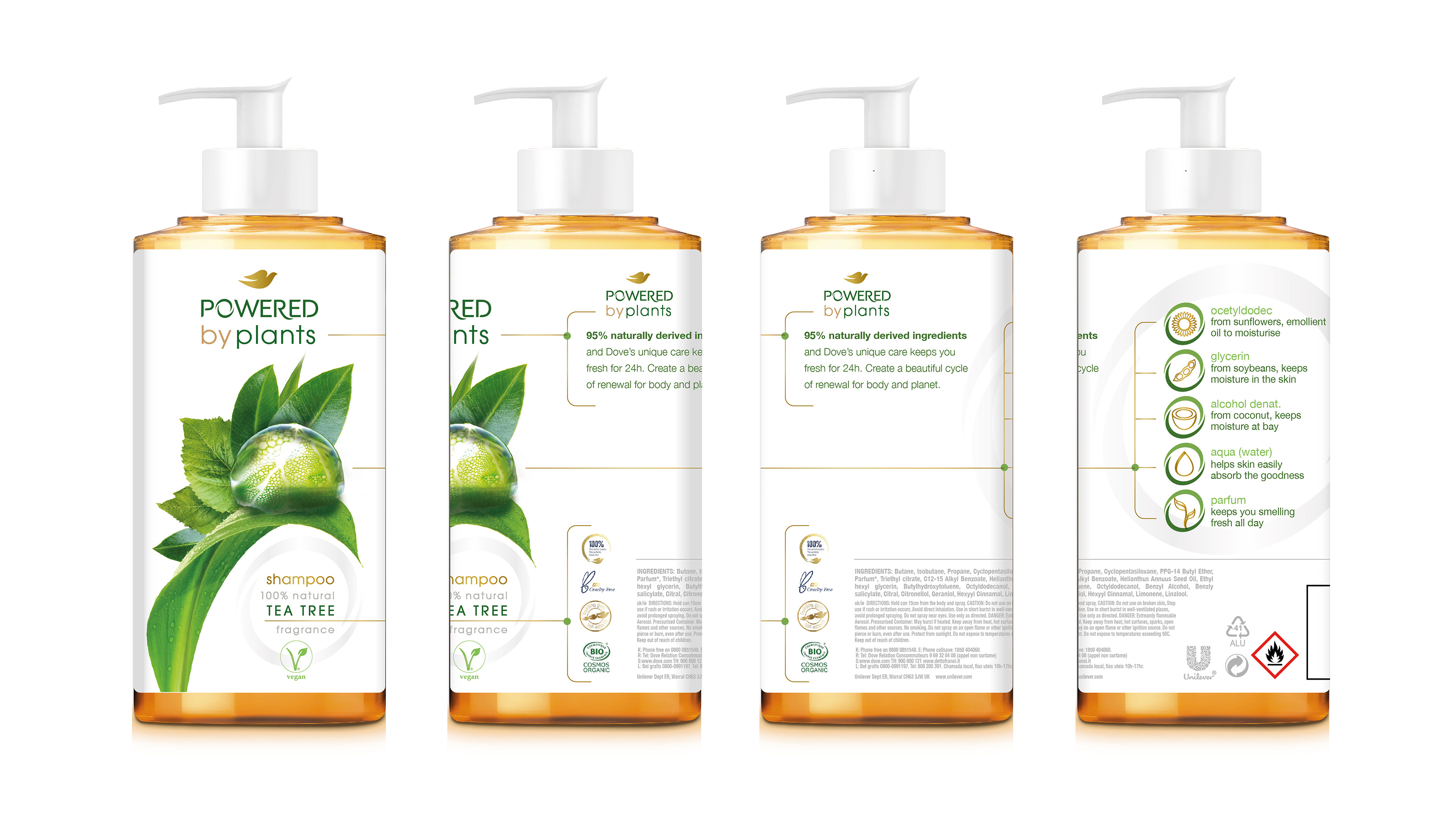 Harnessing the power of plants Showcasing the natural beauty of plants combined with a water droplet that magnifies the plants details to bring the proposition to life. Using a paired back colour palette with accents of gold to elevate the packaging. Elevating the sub brand creating an impactful brand lock up with the dove icon. Developing the design holistically across the whole pack to bring the story to life. Packaging design / Logo development / Illustration composition
